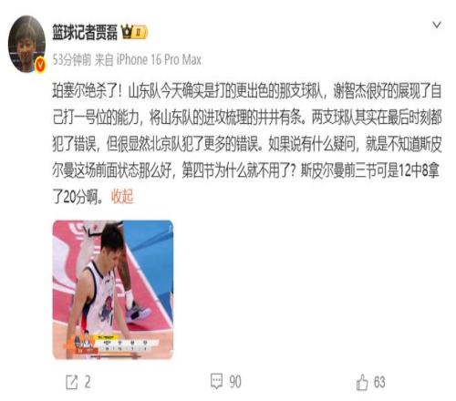 贾磊认为:山东队今天确实是打的更出色的那支球队,谢智杰很好的展现了自己打一号位的能力,将山东队的进攻梳理的井井有条。两支球队其实在最后时刻都犯了错误,但很显然北京队犯了更多的错误。如果说有什么疑问,就是不知道斯皮尔曼这场前面状态那么好,第四节为什么就不用了?斯皮尔曼前三节可是12中8拿了20分啊。