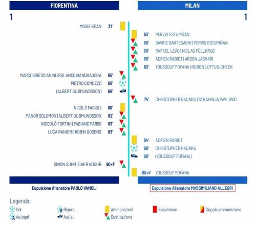 第66分钟,古德蒙德松开出角球,科穆佐头球破门,佛罗伦萨1-0米兰第90分钟,福法纳送助攻,恩昆库爆射破门,米兰1-1佛罗伦萨